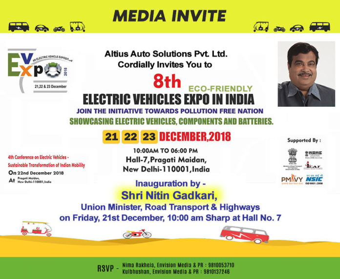 ‘आठवाँ ईवी एक्स्पो 2018’ पर्यावरण-अनुकूल ईलैकट्रिक वाहन प्रौद्योगिकी को समर्पित है जिसका आयोजन नई दिल्ली के प्रगति मैदान में 21 से23 दिसंबर, 2018 को किया जा रहा है। तीन दिवसीय एक्सपो का उद्घाटन केंद्रीय सड़क परिवहन व राजमार्ग मंत्री श्री नितिन गडकरी द्वारा 21 दिसंबर को हॉल नंबर 7 में सुबह 10:00 बजे किया जायेगा।